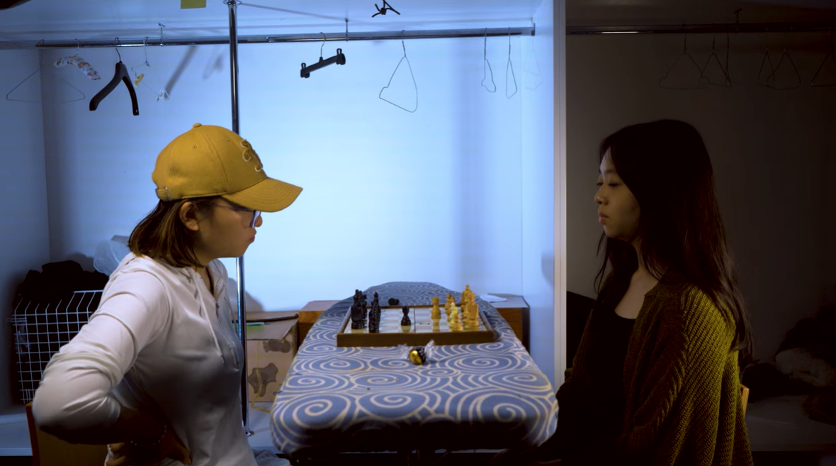 In this exercise, we worked as a team to create a dialogue-free narrative scene, using cinematic language and the actors’ performances to construct a meaningful story. The scene shows two characters playing chess; although their moves are chaotic and disordered, their expressions remain serious and focused. The edited video, combined with background music, creates a comedic tone piece disguised as a mystery.